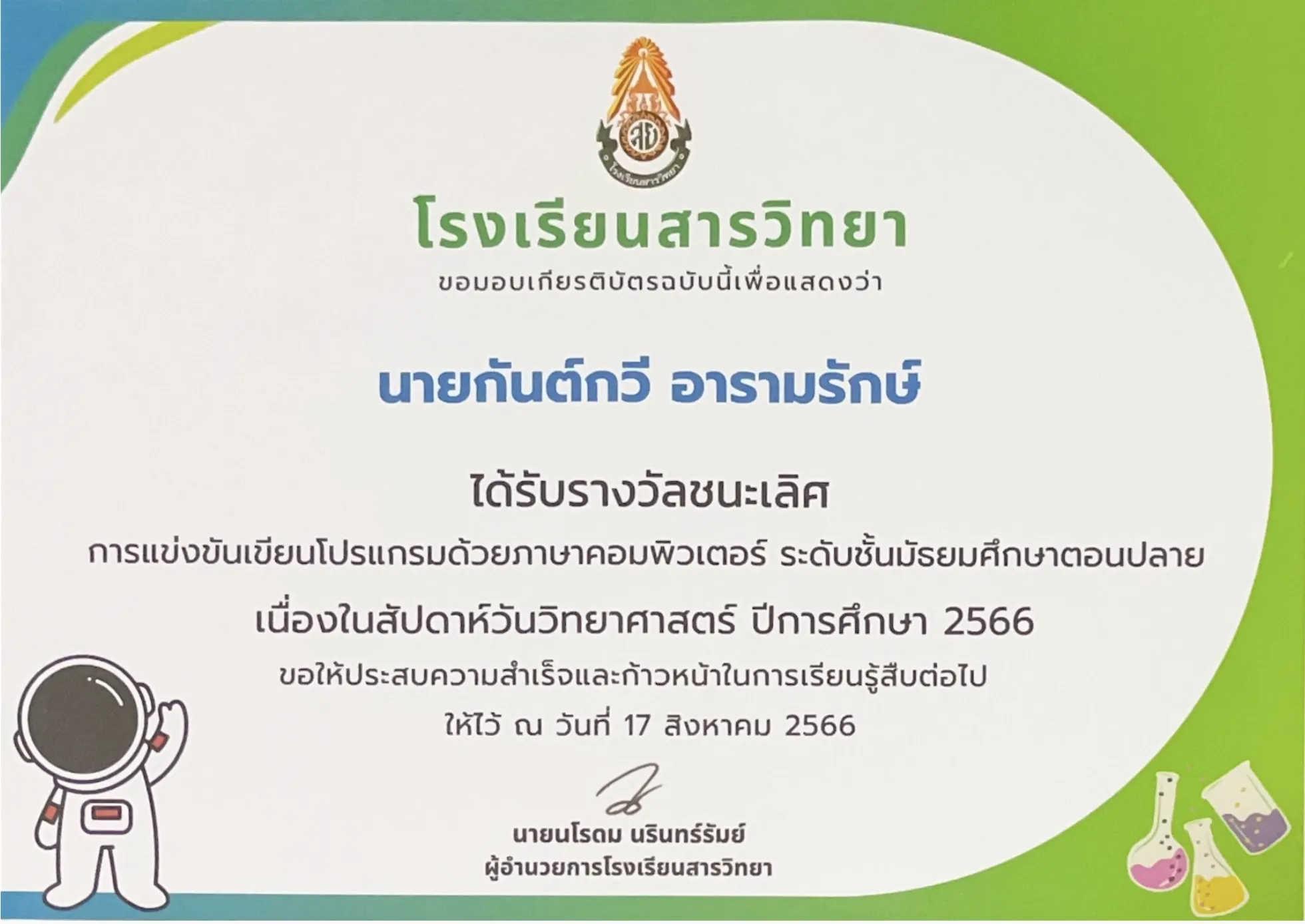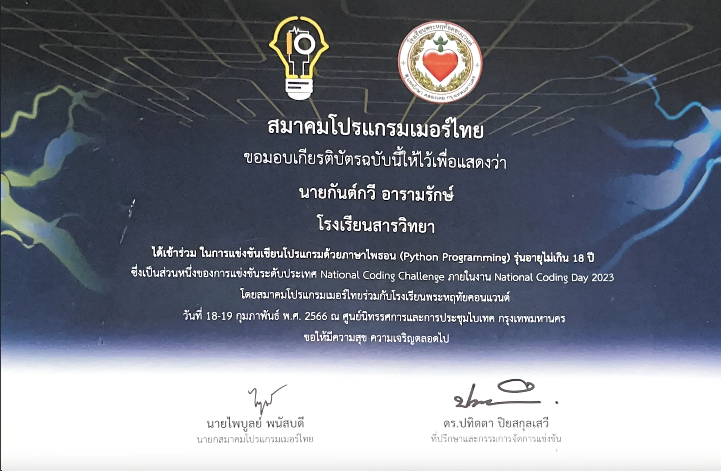 Winner of the high school programming competition during Science Day Week, Sarawittaya School. #2023